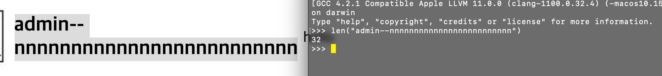 내가 저 아이디를 만들때 "admin--nn ..."해서 n을 30번 누른거로 기억하는데 32자가 나온다.