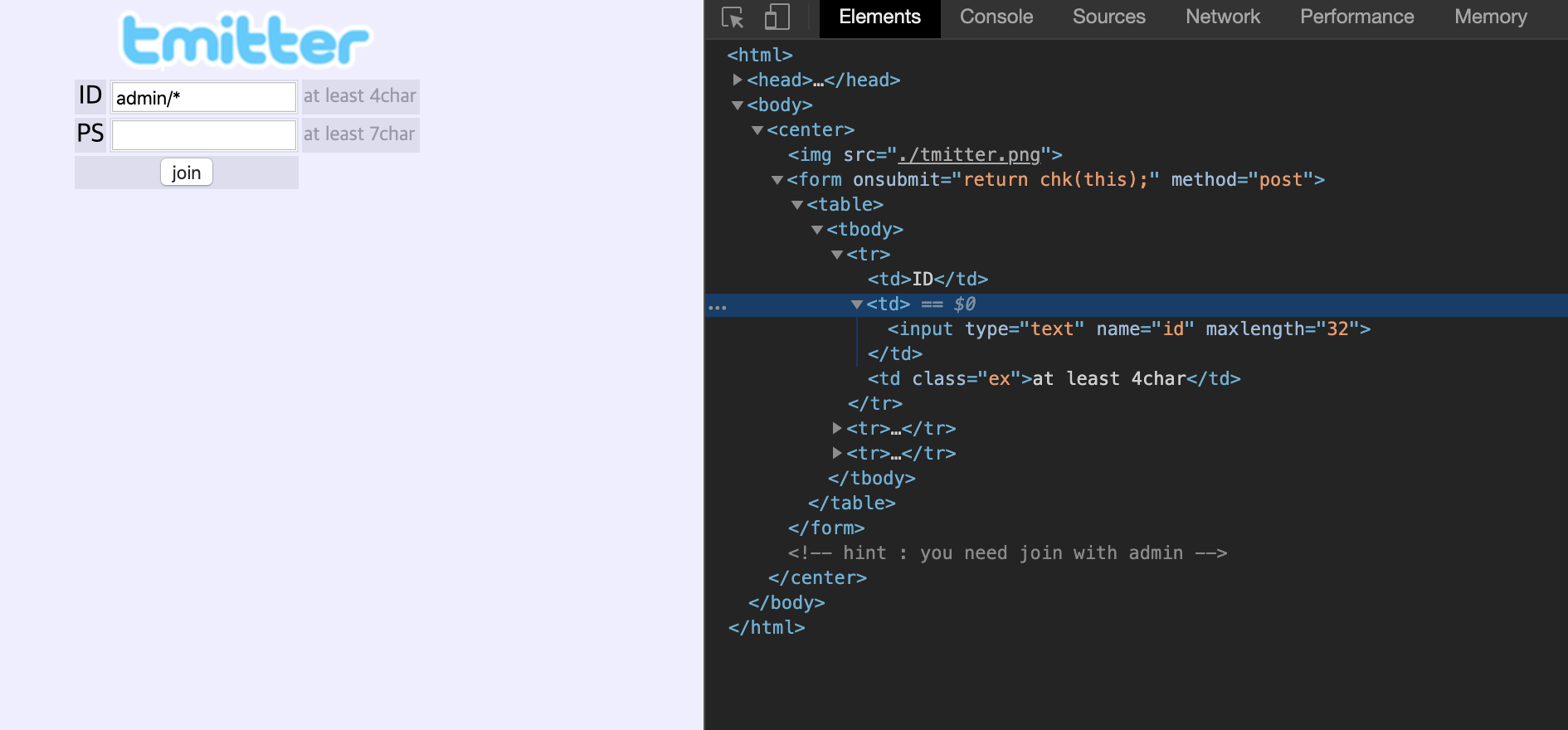 개발자 도구에서 max length를 33으로 수정하고 "admin 1"로 join하니까 1은 잘리고 공백도 무시돼서 admin으로 들어가고, join 했을때 내가 입력한 ps로 table에 올라간다.