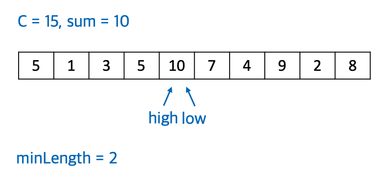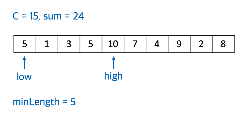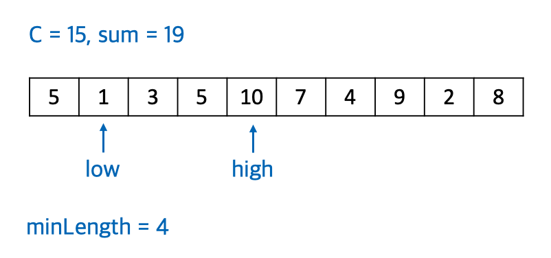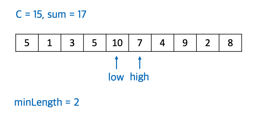 low와 high 사이의 합이 C 미만이라면 high를 한 칸 증가시키고, C와 같거나 크다면 minlength를 갱신시키고 low를 한 칸 증가시킨다.