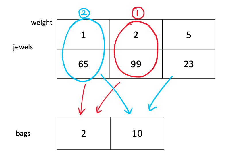 그림에서 1번 가방에 들어갈 수 있는 보석을 다 넣었다면 1번 보석과 2번 보석이 들어가게 된다.