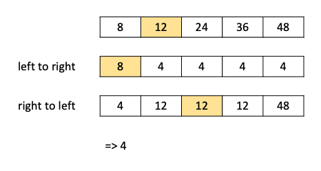 첫 번째 수인 8을 뺐을 때 0번째까지의 최대공약수는 없고, 48부터 12까지의 최대 공약수는 12이다.