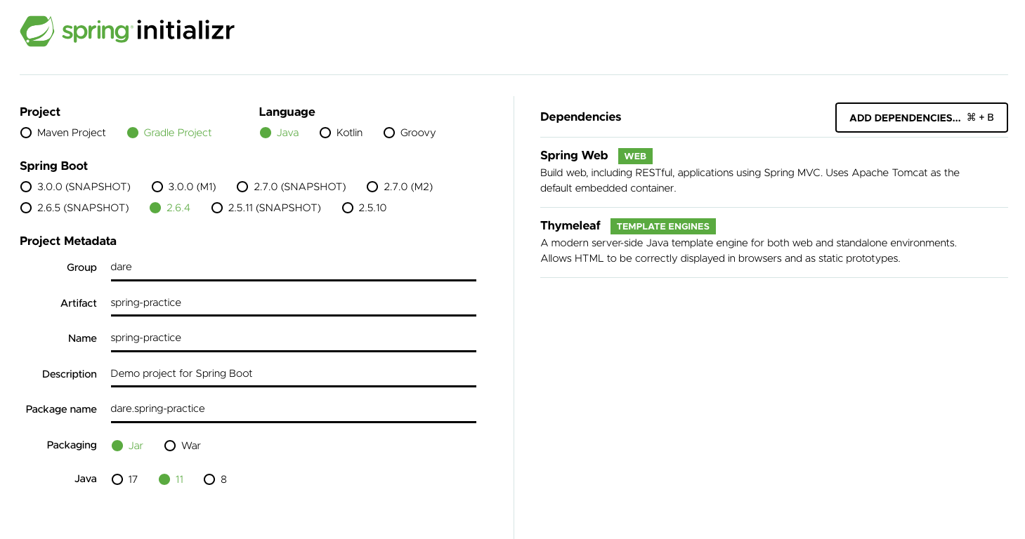 스프링 프로젝트는 https://start.spring.io 에서 생성할 수 있다.