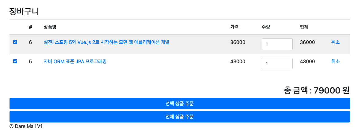 선택 상품 주문같은 경우는 DB의 BAGGED_ITEM에 checked 칼럼을 두어서 그걸 보고 가져올 수 있도록 했다.